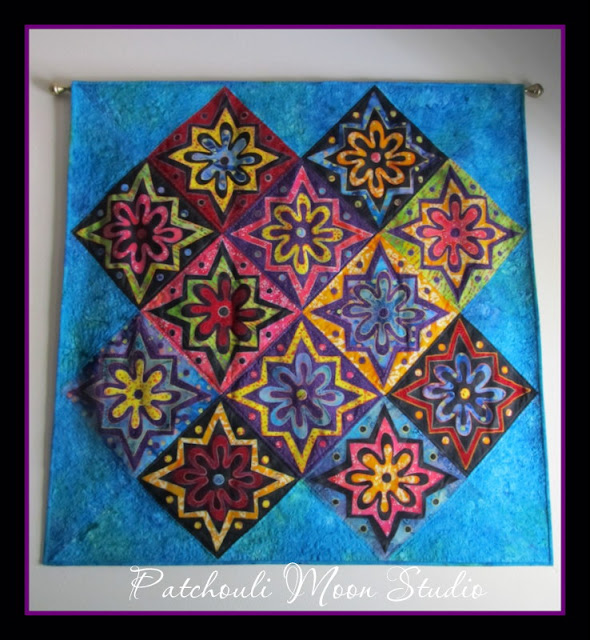 | Rickrack and decorative stitches to enhance the fabric accent strip. I added some crystals and French knots too. I quilted it in wavy lines. |