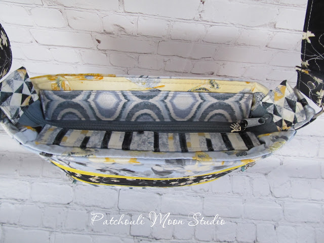This is the Zippy Cross Body Bag that I made on commission last year for a quilt friend. It was a kit that had the pattern and some fabric with it. The problem was there was no indication as to what fabric went to what piece, so I had to do my best at figuring it out and I also wanted to place the fabrics in a pleasing way. I did have to use my own fabric inside the zippered pocket on the inside pocket as I didn't have enough of any of the fabrics left to use. It came out rather patchwork looking, which I like, but also because I had to use what was available of the fabrics given to me. The strap was made from all the leftover pieces that I sewed together in order to make the strap.