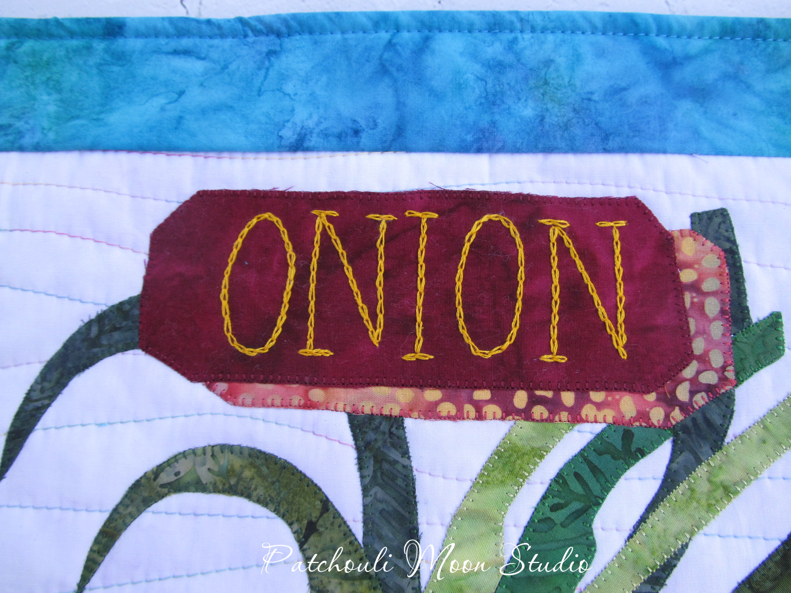 I didn't want to make this into one large quilt, so I made each block separate, which does make them look more like a packet of seeds. I used batik fabrics, mostly scraps, and then added the batik border around each quilt. I machine blanket stitched and then did hand embroidery for the lettering and other things like stems, tendrils, etc.