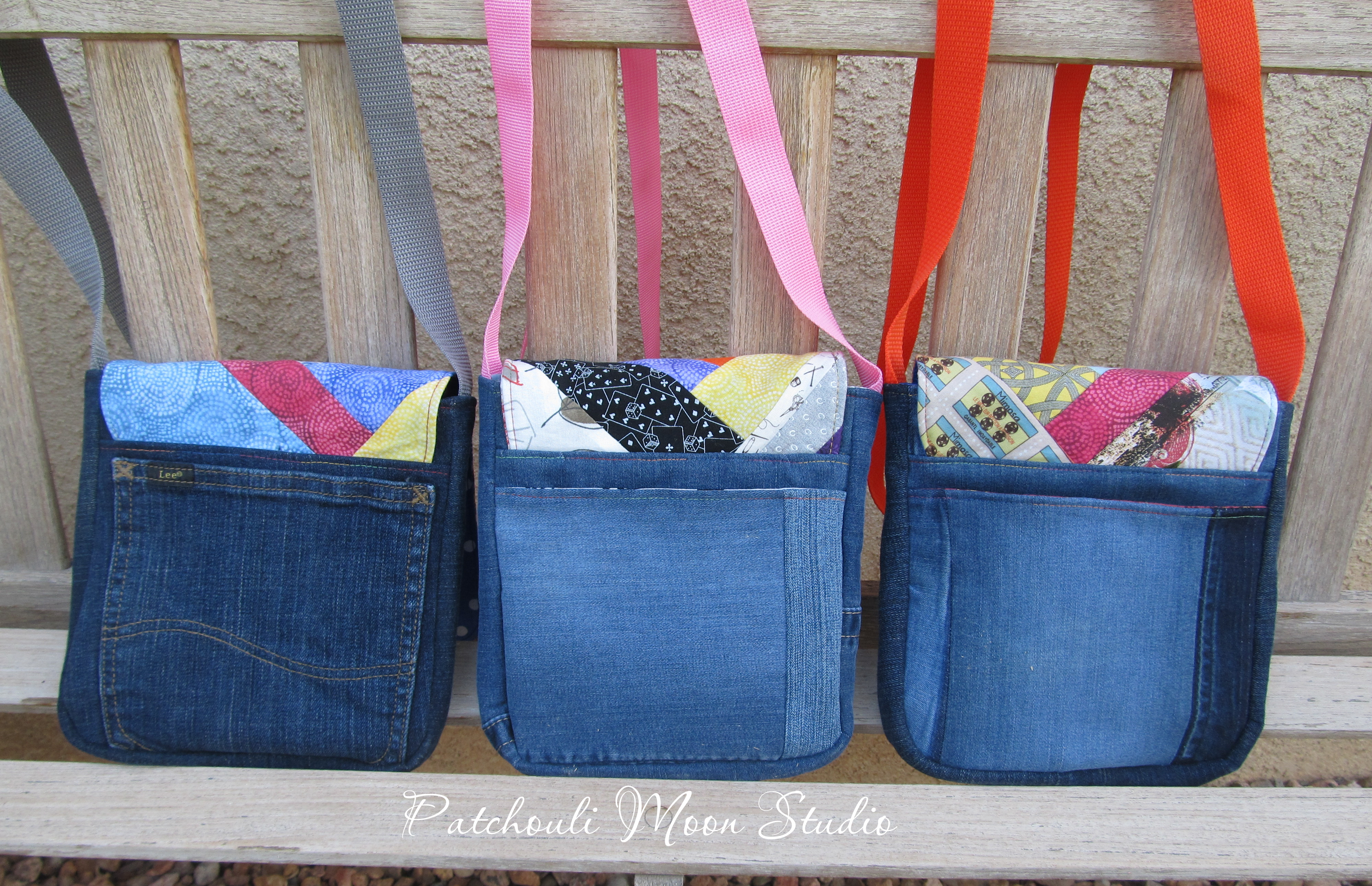 3 More Sew Powerful purses to donate. I loved using up some of my fabric scraps to make these purse flaps. Paired with denim jeans that I upcycled into to purse bodies.